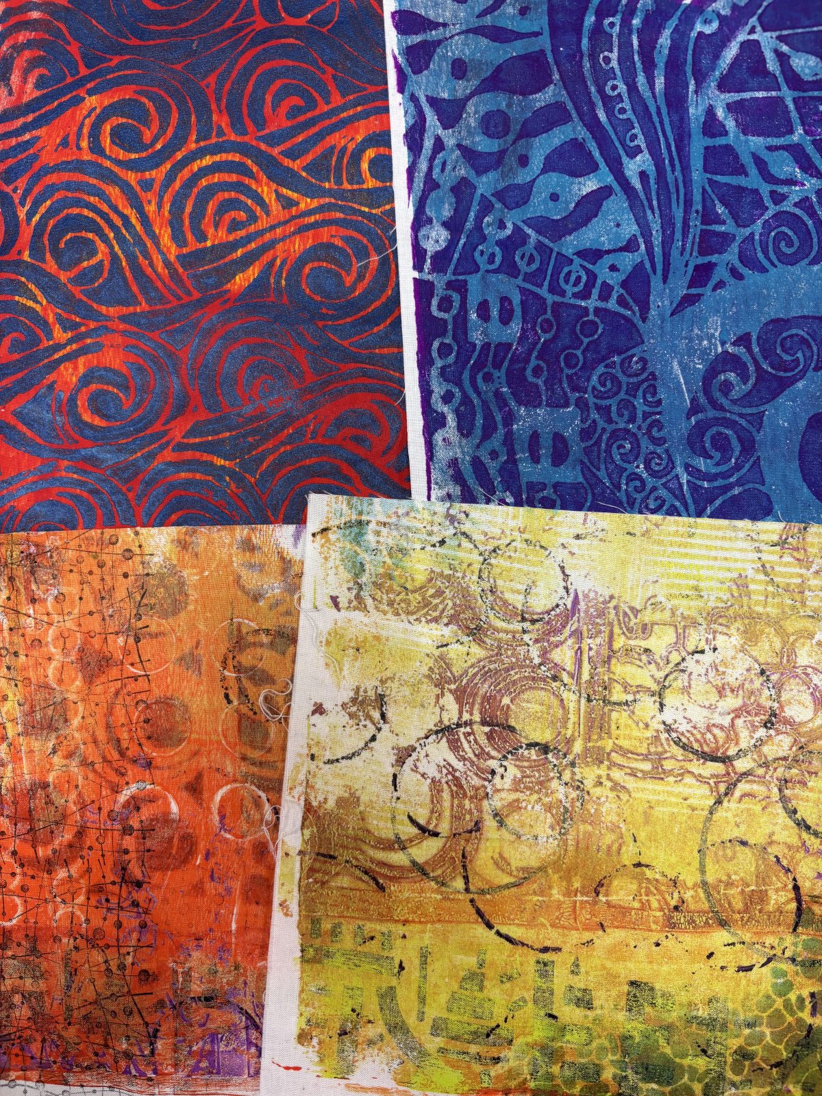 Instructor Teresa Locknane will provide a color theory lesson and step by step guidance through a variety of Gelli plate printing techniques that can be used to create your own printed masterpiece on fabric. Once heat set, the paints are permanent and fabrics can be used in your sewing or quilting projects. Students should have enough time to experiment with colors and supplies to make 10-12 8" x 10" printed pieces in class.